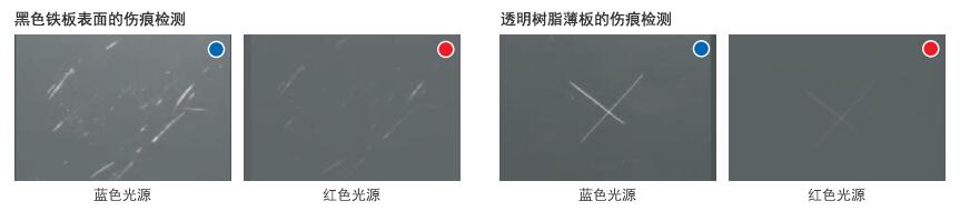 第2組圖是藍色光源和紅色光源分別對黑色鐵板和透明樹脂薄板的傷痕檢測。
