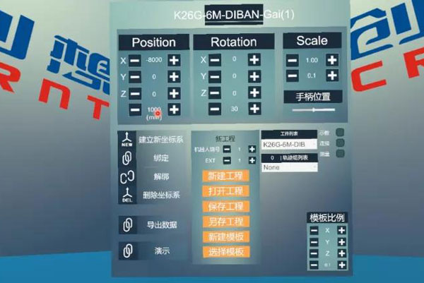 界面空間好似進入一個模擬仿真的房間,操作面板位于中間位置,可以調節(jié)工件在空間中的位置、調整工件或坐標系的角度旋轉、調節(jié)放大比例(對于工件大小方便觀察可以進行放大縮小)。